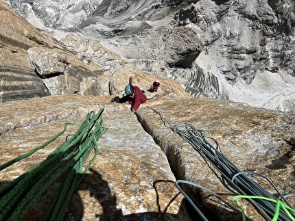 Čtyřčlenný tým Julius Brunner, Sebastian Gantz, Hann Kallweit a Rosa Windelband provedla v srpnu 2025 týmový volný výstup po linii „Eternal Flame“ na Nameless Tower/Trango Tower. © Julius Brunner archive