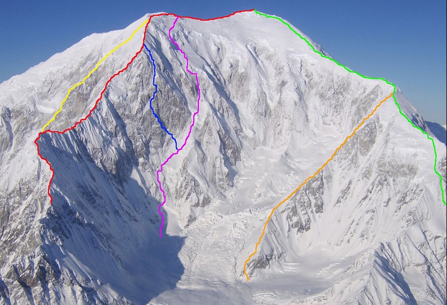 Jihovýchodní stěna Mt. Forakeru - cesty: ZELENÁ: Jihovýchodní žebro, 1963, ČERVENÁ: Francouzské žebro, 1976, ŽLUTĚ: Infinite Spur (spodní část shodná s Fr. žebrem), 1977, RŮŽOVÁ: False Dawn, 1990, ORANŽOVÁ: Viper Ridge, 1991, MODRÁ: Dracula, 2010